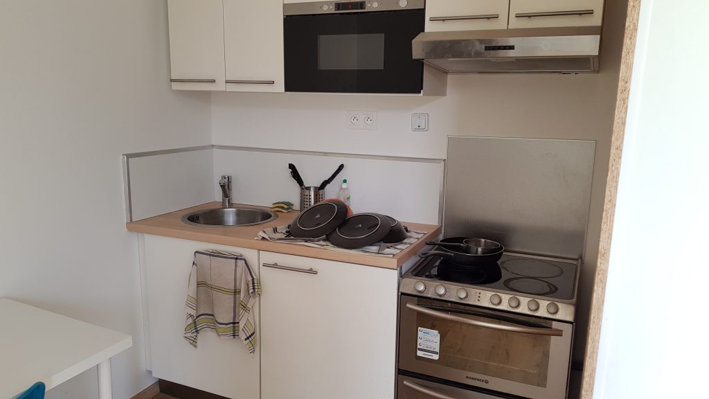• la pièce de vie est équipée d’une télé et de mobilier adaptable au locataire (table basse, bureau suivant les besoins) et d’un véritable lit 140*200 escamotable libérant un réel espace de vie pour la journée, tout en proposant un confort de couchage optimum.
